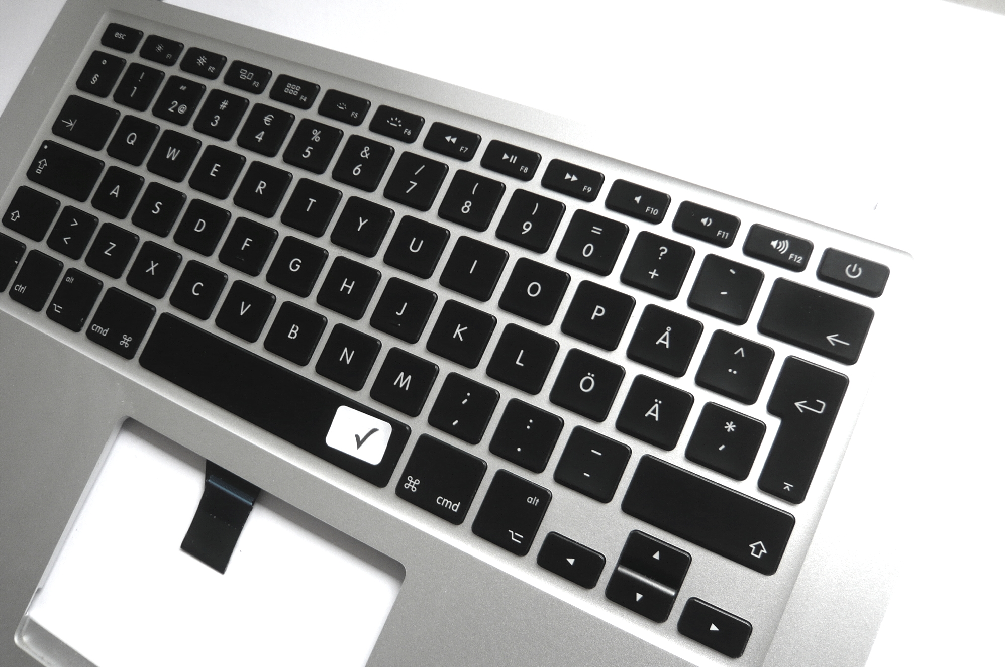 Durch den einfachen Tausch einiger Tastenkappen mit Ihrer alten Tastatur können Sie die Tastatursprache (z.B. auf Deutsch) wechseln. Taste mit flachem Werkzeug von unten anheben, mit der Fingerkuppe schnell nach oben abziehen. Die andere Tastenkappe einfach wieder auflegen und festklicken.