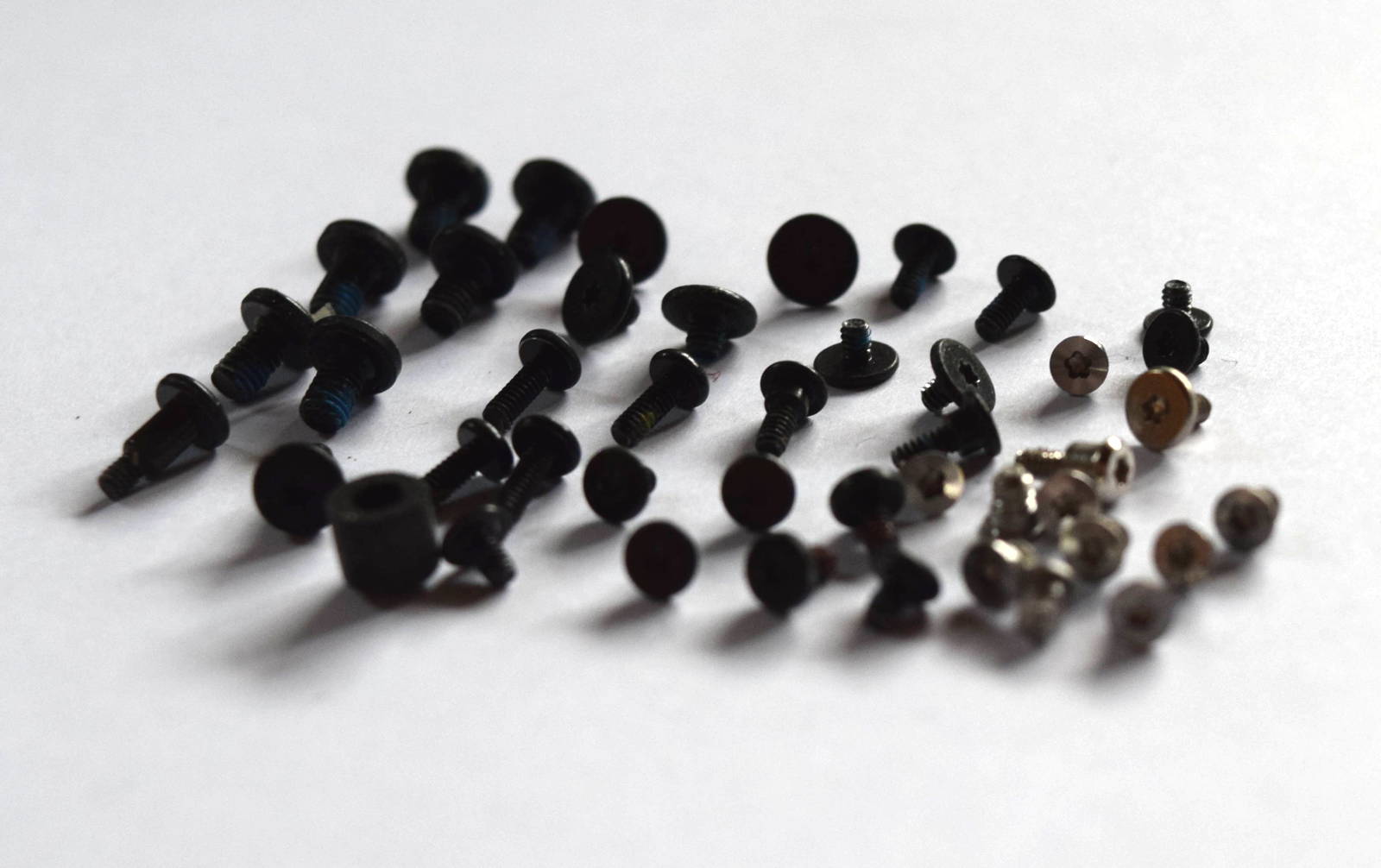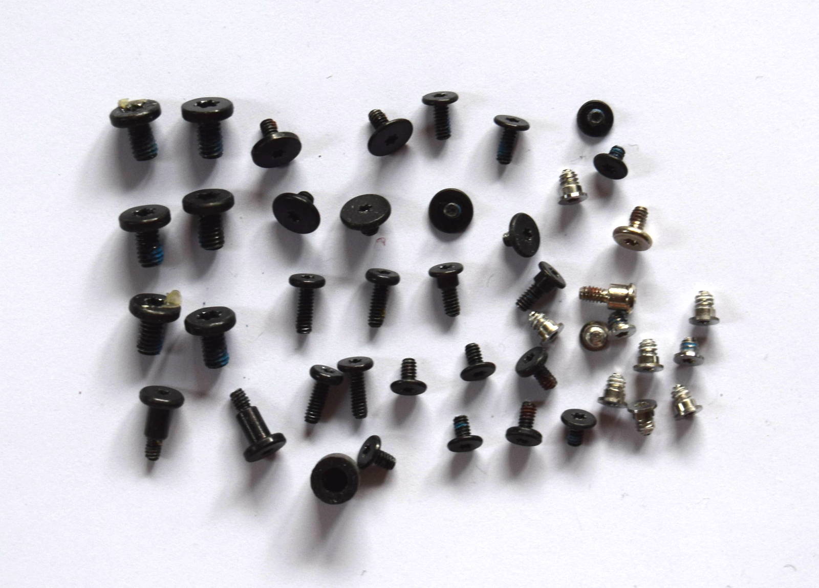 All internal and external screws except the two battery screws, the Traxckpad screws and the screws for the headphone jack (2012/early 2013).